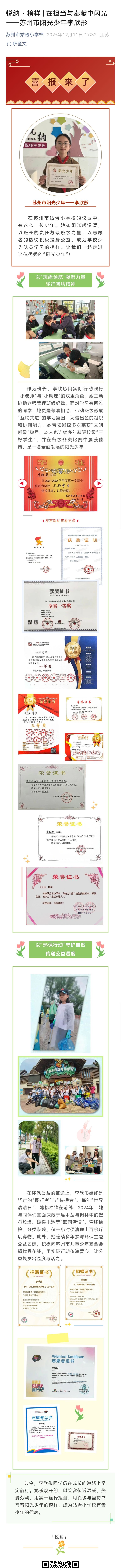 悦纳 · 榜样 | 在担当与奉献中闪光——苏州市阳光少年李欣彤